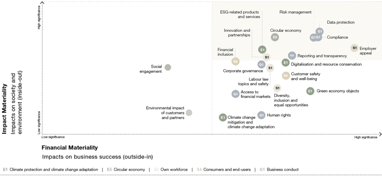 As part of our materiality analysis, we assess which significant positive and negative impacts, opportunities and risks (IROs) exist for grenke. In accordance with the dual materiality principle, the analysis includes both an inside-out perspective (grenke's impact on society and the environment) as well as an outside-in perspective (impact of sustainability aspects on grenke). The materiality analysis is reviewed and updated annually.