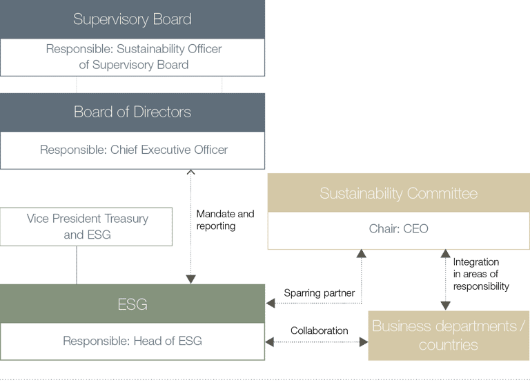 As a publicly listed company by German law, grenke AG has three governing bodies. The Managing Board is entrusted with the management of the company, while the Supervisory Board signs responsible for supervising it, as the Annual General Meeting is responsible for representing the interests of the shareholders. Sustainability at grenke is the responsibility of the CEO, Dr. Sebastian Hirsch. Dr. Ljiljana Mitic, Member of the Supervisory Board, advises the Board as Sustainability Officer. In addition, the full Supervisory Board, together with the Managing Board, discusses ESG related topics, their management and the implementation of measures to increase sustainability in detail at the annual strategy meeting. The Audit Committee of the Supervisory Board signs responsible for auditing and monitoring the sustainability report in accordance with the requirements of the CSRD. The ESG department manages sustainability activities in close coordination with the Management Board and the specialist departments. It develops solutions and manages the operational implementation of our sustainability strategy at grenke Group. The Sustainability Committee supports and advises the ESG department on operational implementation in the specialist areas. The committee is made up of senior managers from the ESG, Refinancing, Human Resources, Purchasing and Portfolio Management, Sales, Risk Management, Accounting, Tax and Investor Relations departments, as well as the Sustainability Officer of the Supervisory Board. It is headed by our CEO.