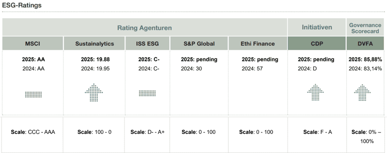 ESG-Ratings und -Benchmarks können den Zugang zum Kapitalmarkt für nachhaltig agierende Unternehmen erleichtern. Sie ermöglichen Investoren die Nachhaltigkeitsleistung von Unternehmen zu bewerten und zu vergleichen. Unser Unternehmen wird von verschiedenen führenden ESG Rating-Agenturen bewertet. Zudem nehmen wir an ESG-Initiativen wie dem Carbon Disclosure Project teil.