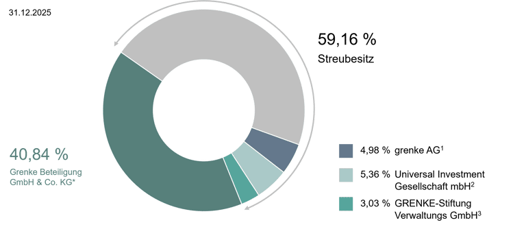Als mittelständisch geprägtes Unternehmen verfügen wir mit der Grenke Beteiligung GmbH & Co. KG über eine Großaktionärin. In Folge der Umstrukturierung der Grenke Beteiligung GmbH & Co. KG in eine Einheitsgesellschaft, in der die KG sämtliche Geschäftsanteile der Komplementär-GmbH hält, fungiert die Grenke Vermögensverwaltung GmbH – entsprechend unserer WpHG-Meldung vom 7. November 2025 – nicht mehr als Muttergesellschaft der Grenke Beteiligung GmbH & Co. KG, sodass ihr auch die Stimmrechte aus den von der Grenke Beteiligung GmbH & Co. KG gehaltenen Aktien nicht mehr zugerechnet werden. Die Kommanditisten der Grenke Beteiligung GmbH & Co. KG setzen sich weiterhin zusammen aus Anneliese Grenke, dem Unternehmensgründer Wolfgang Grenke sowie deren drei gemeinsamen erwachsenen Söhnen Moritz, Roland und Oliver Grenke. Zum Stichtag 31. Dezember 2025 hielt die Grenke Beteiligung GmbH & Co. KG unverändert 40,84 Prozent der Unternehmensanteile. Infolge des im Jahr 2024 abgeschlossenen Aktienrückkaufprogramms hielt die grenke AG im vergangenen Geschäftsjahr unverändert eigene Aktien in Höhe von 2.317.695 Stück, dies entspricht einem Anteil von 4,98 Prozent eigener Aktien. Komplettiert werden die Gesellschaften, die zum in der jeweiligen Stimmrechtsmitteilung genannten Veröffentlichungsdatum einen Anteil von über 3 Prozent hielten, durch die Universal Investment Gesellschaft mbH mit einem Anteil von 5,36 Prozent und die GRENKE-Stiftung mit 3,03 Prozent. Der Streubesitz nach Ziffer 5.7.2 des aktuellen „DAX Equity Index Methodology Guide“ betrug entsprechend 59,16 Prozent. Der Anteil der Aktien im Besitz von Vorstand und Aufsichtsrat betrug zum Stichtag rund 0,2 Prozent. Der individuelle Aktienbesitz der Mitglieder im Vorstand und Aufsichtsrat kann der Tabelle in Abschnitt 8.6, „Anteilsbesitz von Vorstand und Aufsichtsrat“, in der Erklärung zur Unternehmensführung entnommen werden.