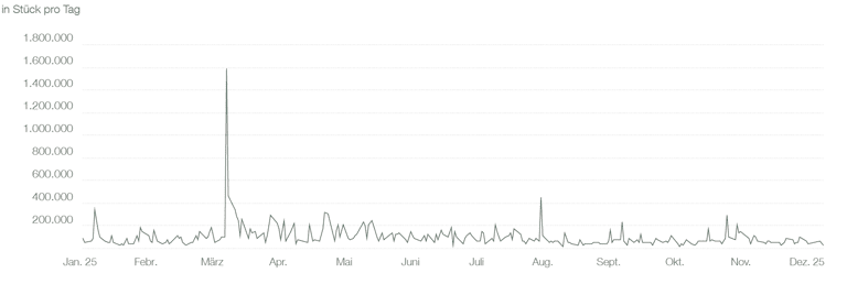 Im Geschäftsjahr 2025 lag das durchschnittliche Handelsvolumen der grenke Aktie auf Xetra bei 102.771 Stück pro Tag. Zur Veröffentlichung der Gesamtjahreszahlen 2025 wurde am 13. März 2024 der größte Tagesumsatz mit 1.583.715 Stück registriert. Der niedrigste Tagesumsatz von 17.737 Stück wurde am 25. August 2025 erzielt. Das gesamte Handelsvolumen der grenke Aktie auf Xetra lag im Geschäftsjahr 2025 bei 26 Mio. Stück.
