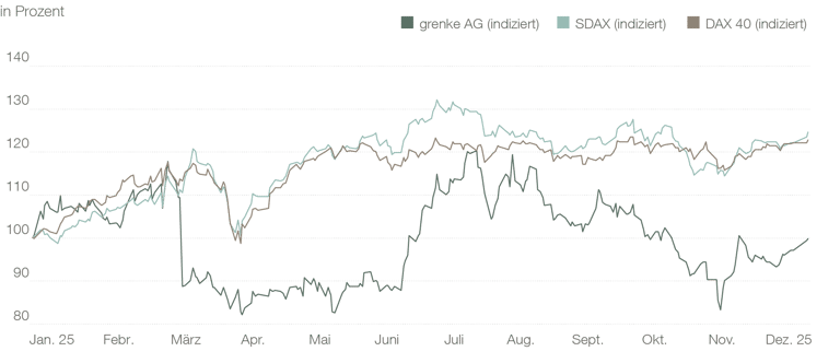 Der Aktienkurs der grenke AG zeigte sich im Geschäftsjahr 2025 in einem insgesamt herausfordernden Kapitalmarktumfeld volatil. Nach ihrer Eröffnung bei 15,66 EUR am 2. Januar 2025 zog der Aktienkurs zunächst an und notierte am 12. März 2025 bei 17,12 EUR. Mit der Veröffentlichung der Geschäftsjahreszahlen und der Guidance für das Jahr 2025 am 13. März 2025 sank die Aktie auf 13,90 EUR und bewegte sich im Weiteren zunächst seitwärts. Am 10. April 2025 notierte sie zu ihrem Jahrestiefstwert von 12,86 EUR. Ende Juni 2025 setzte – ähnlich wie beim SDAX – eine erneute Aufwärtsbewegung ein, die durch die Veröffentlichung der Neugeschäftszahlen zum zweiten Quartal am 3. Juli 2025 gestützt wurde. In Folge notierte die Aktie mit 18,84 EUR am 28. Juli 2025 zum Jahreshöchststand. Die Aktie zeigte im weiteren Verlauf eine Abwärtstendenz bis zum 19. November 2025 auf einen Wert von 13,04 EUR. In diesen Zeitraum fiel auch die Veröffentlichung der Zahlen zum dritten Quartal mit einer Einordung der Guidance am 13. November 2025. Am 20. November 2025 drehte sich der Aktienkurs, sodass die Aktie bis zum Ende des Geschäftsjahres wieder zulegte. Am 30. Dezember 2025 schloss die grenke Aktie bei einem Kurs von 15,64 EUR, der nahezu dem Eröffnungskurs am 2. Januar 2025 entsprach. Die exakte Kursveränderung im Gesamtjahr 2025 betrug –0,13 Prozent. Mit einer Gesamtzahl von 46.495.573 Namensaktien lag die Marktkapitalisierung der grenke AG zum 31. Dezember 2025 bei 727 Mio. EUR. Der Embedded Value (Substanzwert) belief sich zum 31. Dezember 2025 auf 1.608 Mio. EUR. Dieser umfasst das Eigenkapital und zukünftig erwartete barwertige Cashflows des Bestandsgeschäfts nach Kosten und Risikovorsorge und stellt deshalb einen wirtschaftlichen Gradmesser zur Bewertung dar. Pro Aktie ergibt sich ein Substanzwert von 36,40 EUR.