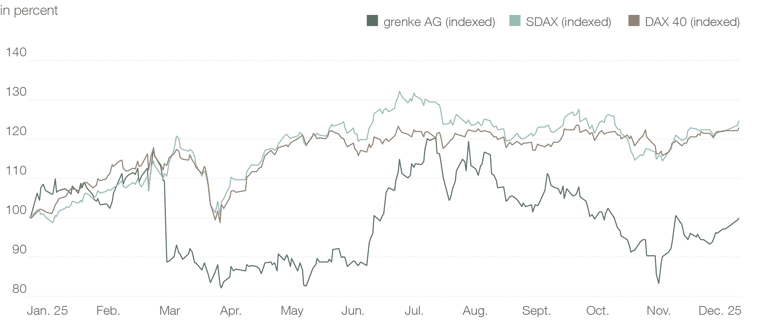 The shares subsequently trended lower, falling to EUR 13.04 by November 19, 2025. This period also included the publication of third-quarter figures and an interpretation of the guidance on November 13, 2025. On November 20, 2025, the share price reversed course, posting gains through to the end of the financial year. On December 30, 2025, grenke shares closed at EUR 15.64, close to the year’s opening price on January 2, 2025. The actual share price change for the full year 2025 was – 0.13 percent.