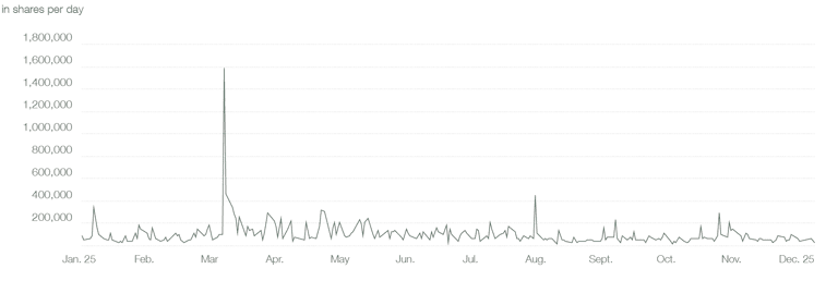 In 2025, the average daily trading volume in grenke shares on Xetra was 102,771 shares. The highest daily trading volume was 1,583,715 shares, recorded on March 13, 2025, upon publication of the 2024 full-year results. The lowest single-day trading volume was 17,737 shares on August 25, 2025. Over the full 2025 financial year, the total trading volume in grenke shares on Xetra reached 26 million shares.